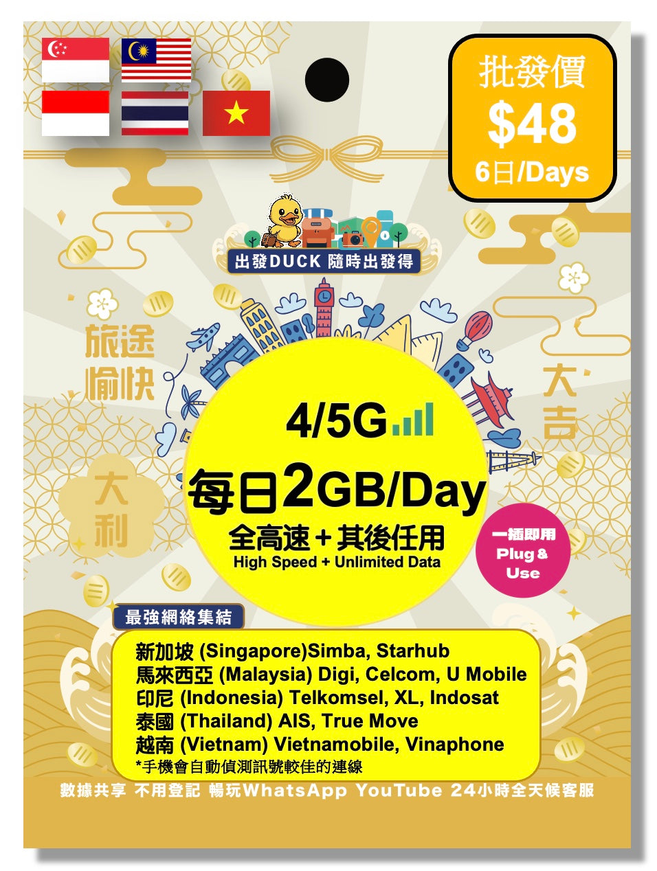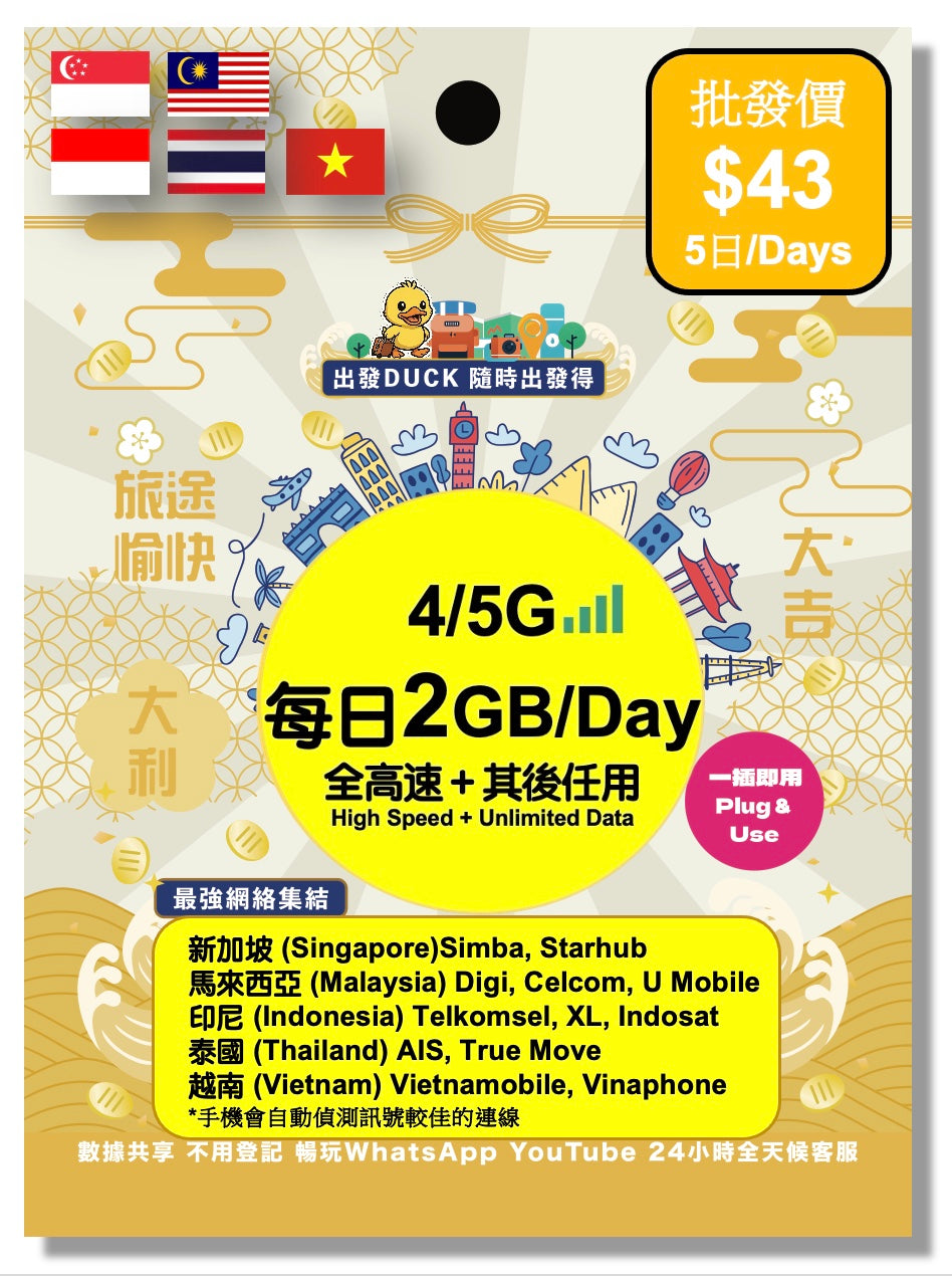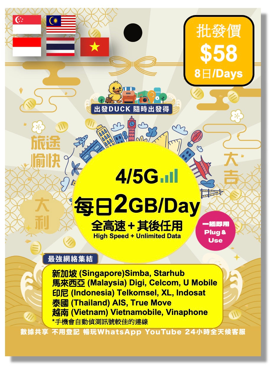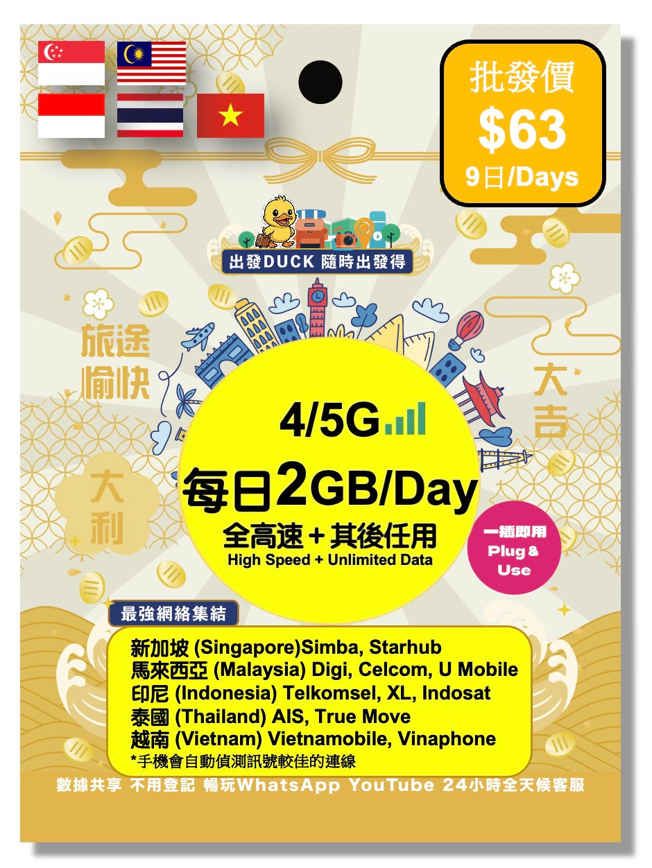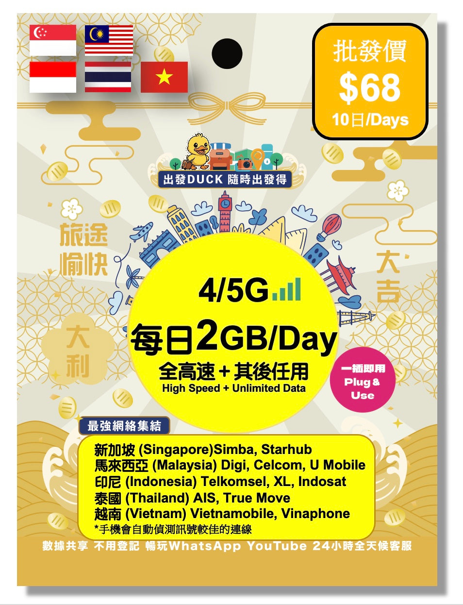 「出發DUCK」新馬印泰越每日2GB 全高速旅遊數據卡