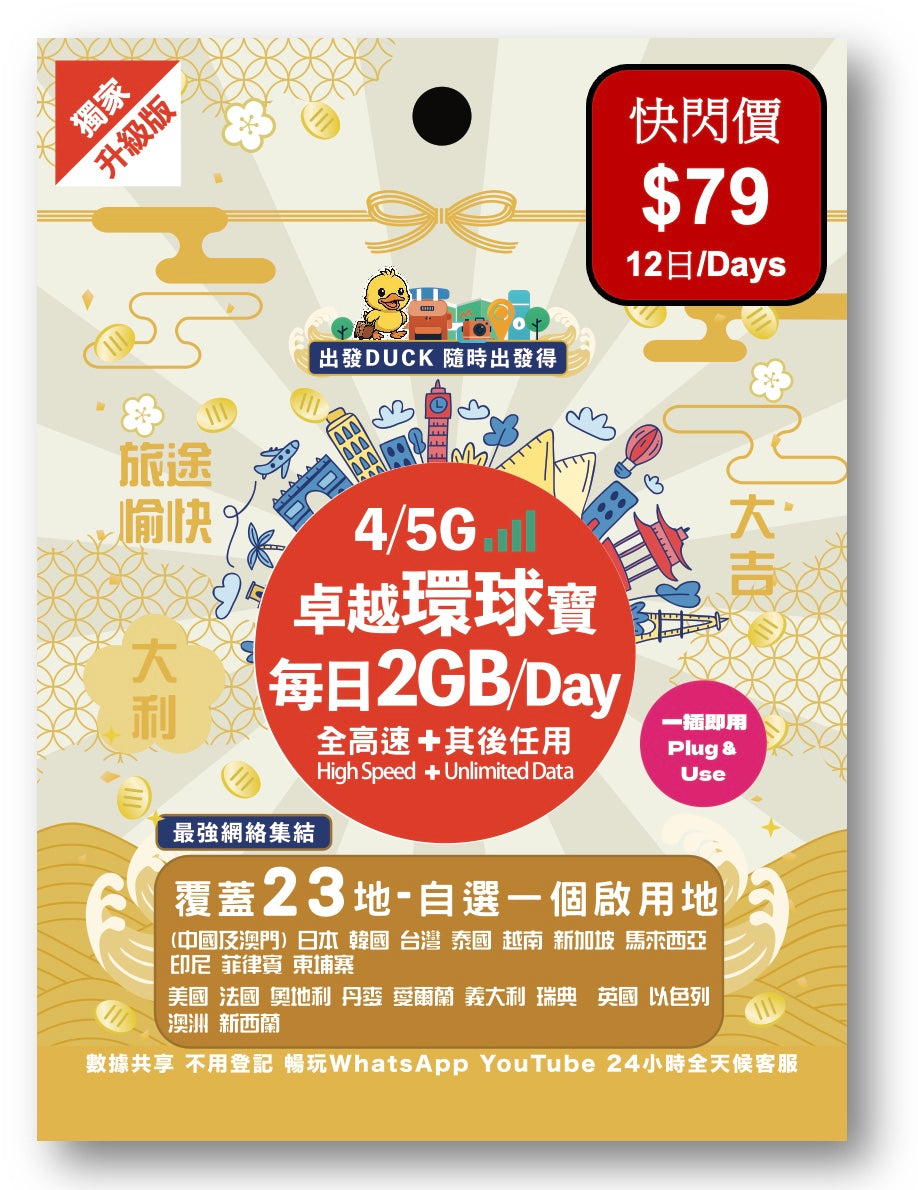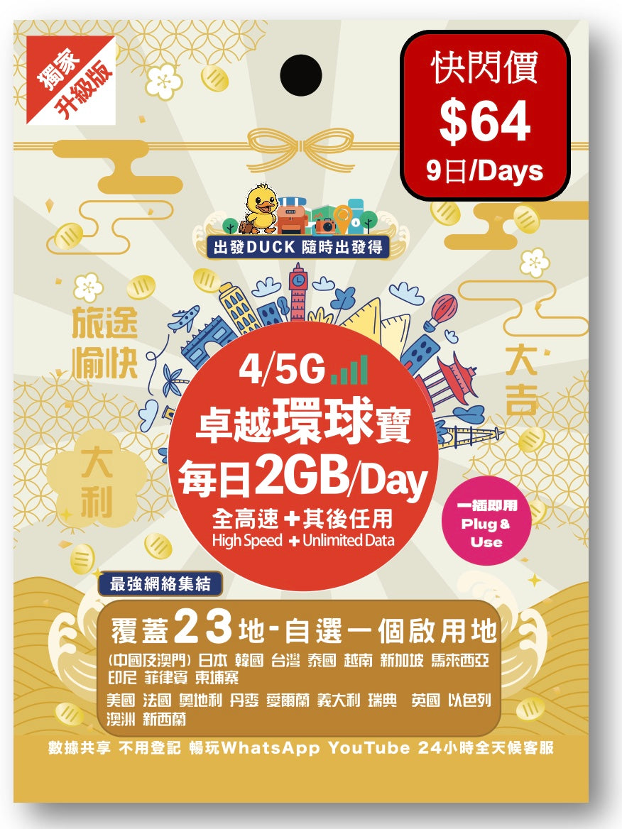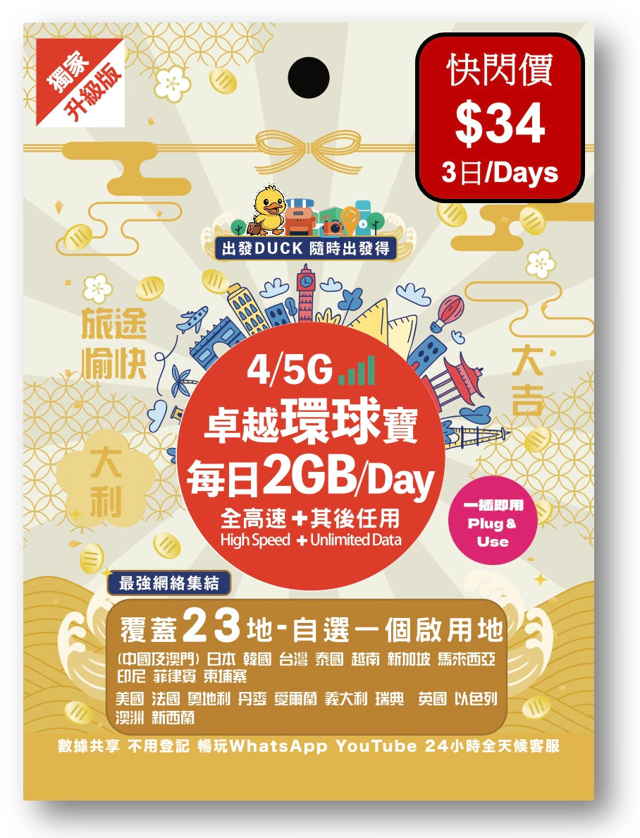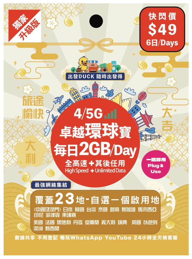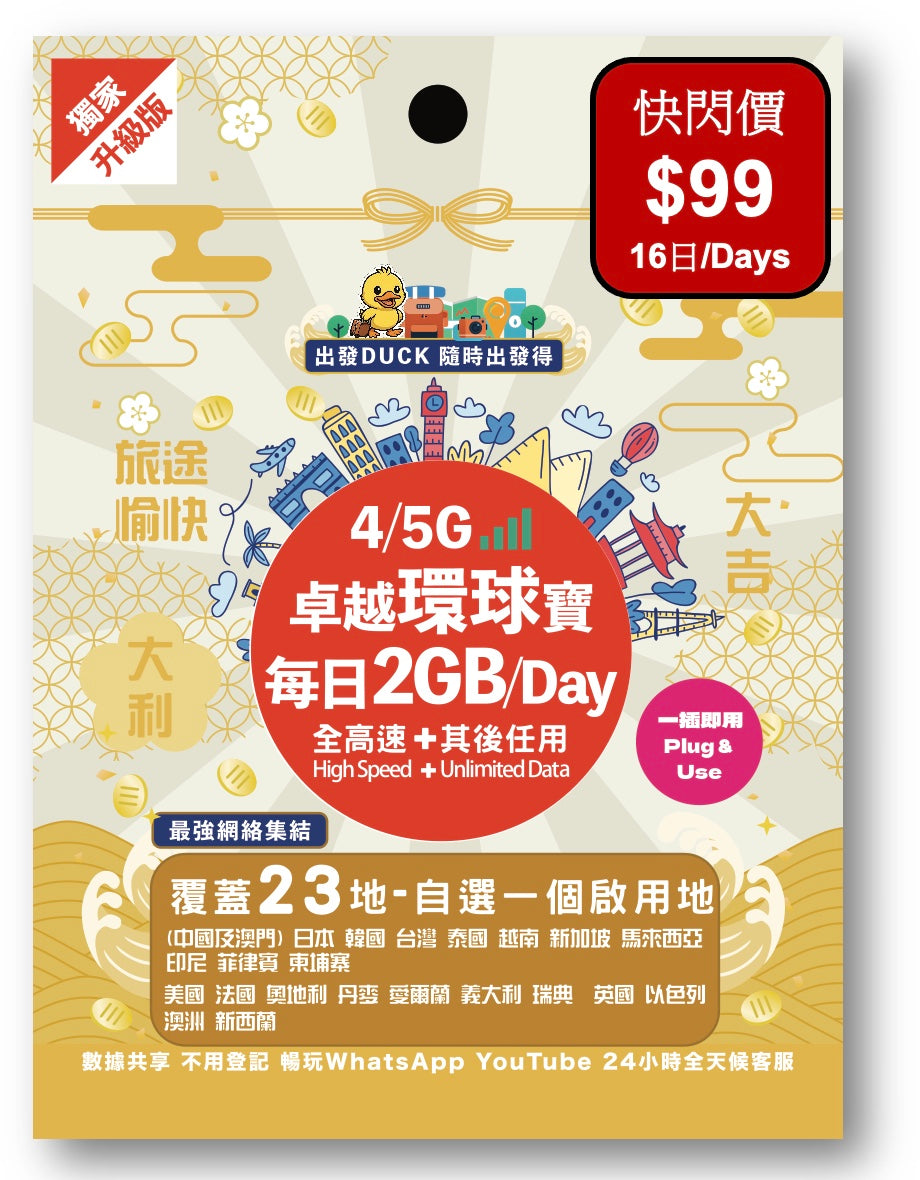 「出發DUCK」全新推出「卓越環球寶」覆蓋23個熱門地,包括中國/澳門,日本,韓國,台灣,泰國,歐洲等多地,無限數據任用,暢遊上網無限制,無論打卡分享、導航查資料,或者視像通話,全程高速穩定。最平只需$29,性價比超高,絕對係最抵選擇!