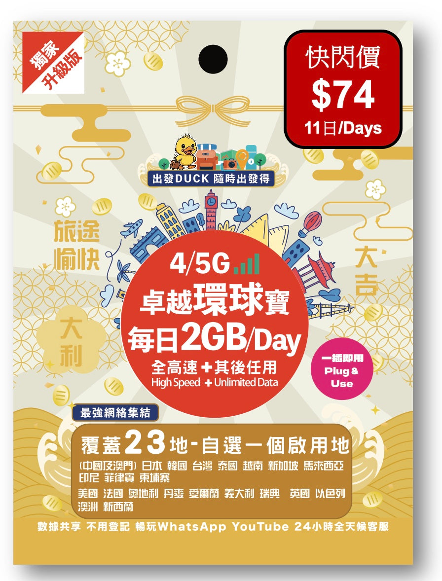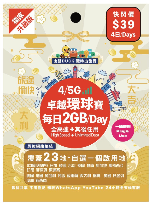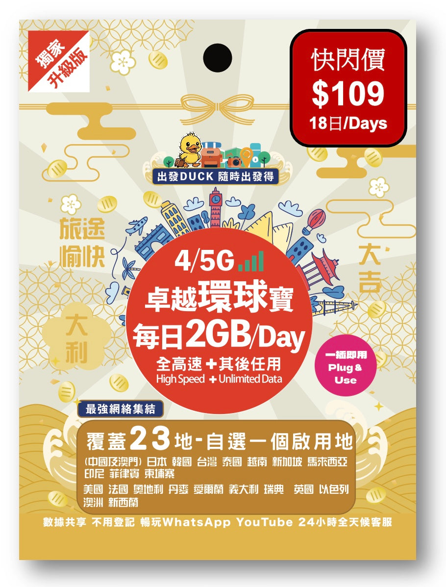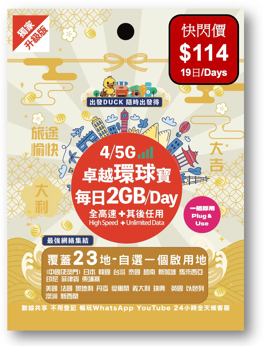 「出發DUCK」全新推出「卓越環球寶」覆蓋23個熱門地,包括中國/澳門,日本,韓國,台灣,泰國,歐洲等多地,無限數據任用,暢遊上網無限制,無論打卡分享、導航查資料,或者視像通話,全程高速穩定。最平只需$29,性價比超高,絕對係最抵選擇!